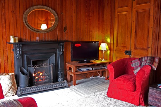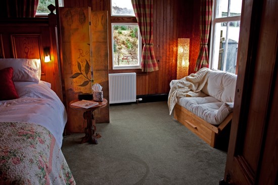 'The Old Ticket Office' is now the lounge with the original pitch pine cladding on the walls, wooden floor and ceiling and original Victorian fire-place-a basket of logs and coal is provided. The ticket hatch has been preserved as it was, and the lounge is equipped with LCD television with Freesat and DVD player. The comfy sofa converts to a double bed together with tub chair, armchair, bean bags and footstool. Complementary warm coloured furnishings help create a calming and serene lounge in the colder months, and lighter colours in the summer provide an airier feel to this famous old room.